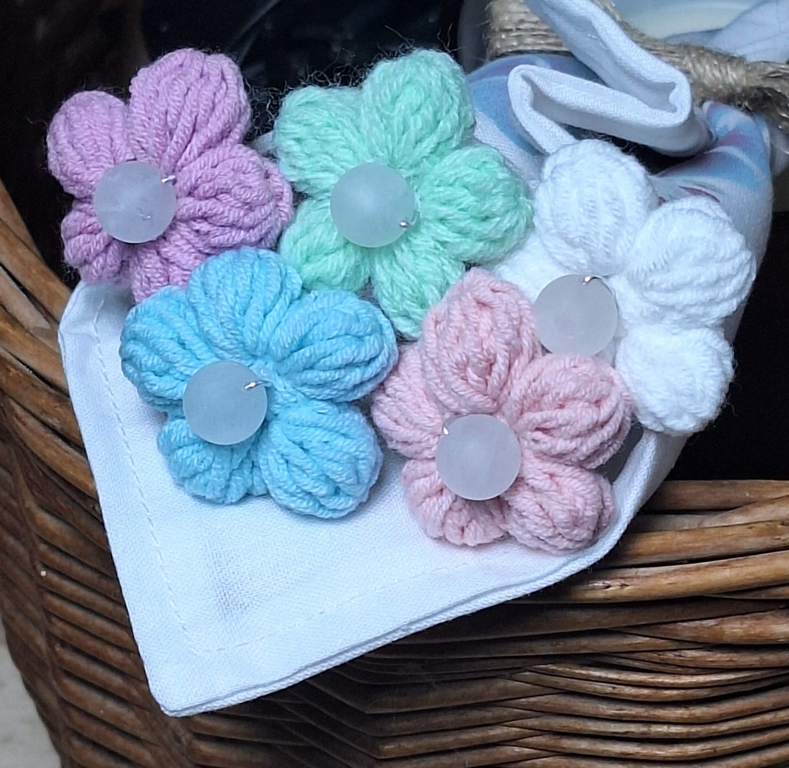 A beautiful bouquet of a set of 5 handmade crocheted flowers delicately encased in a cotton wrap.