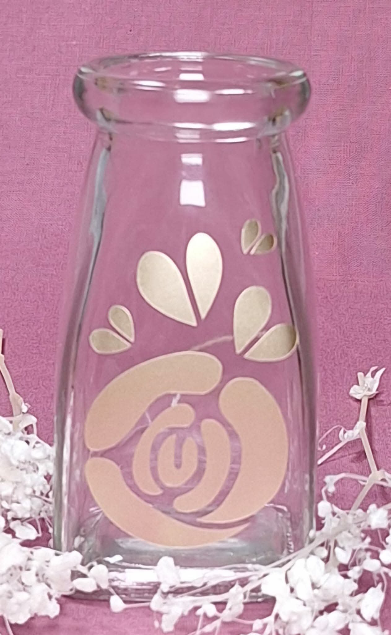 Bring a touch of timeless charm to your space with this handcrafted bud vase, adorned with my original Renee Mackintosh–inspired rose and heart motif. The delicate design is applied in champagne gold vinyl, giving the glass a warm, elegant finish that catches the light beautifully.