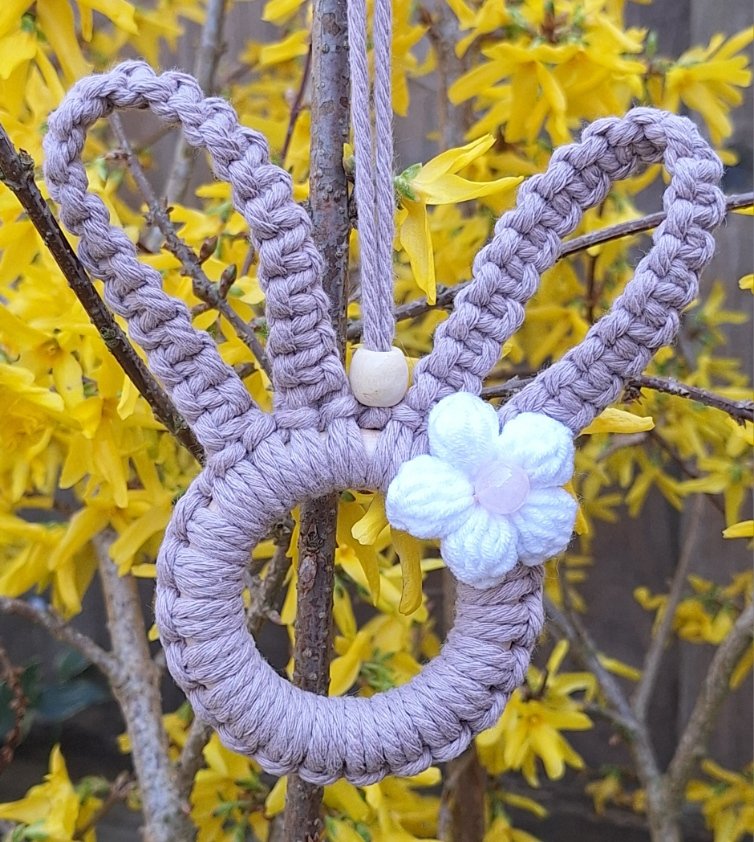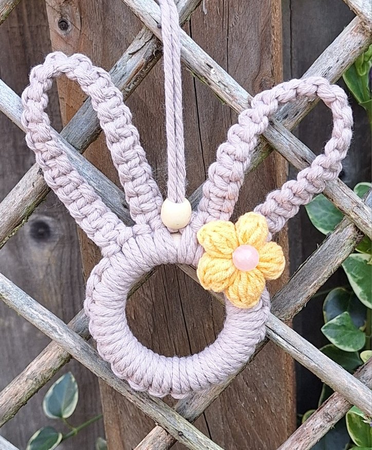 Make your home feel renewed with this Spring Bunny Macrame Hoop featuring a delicate crocheted flower centred with a rose quartz bead. Each bunny is handmade with care and you can pick colours to suit your decor. It comes in creamy white or warm brown macrame cord and the flowers come in pink, yellow, white, green, blue or purple.