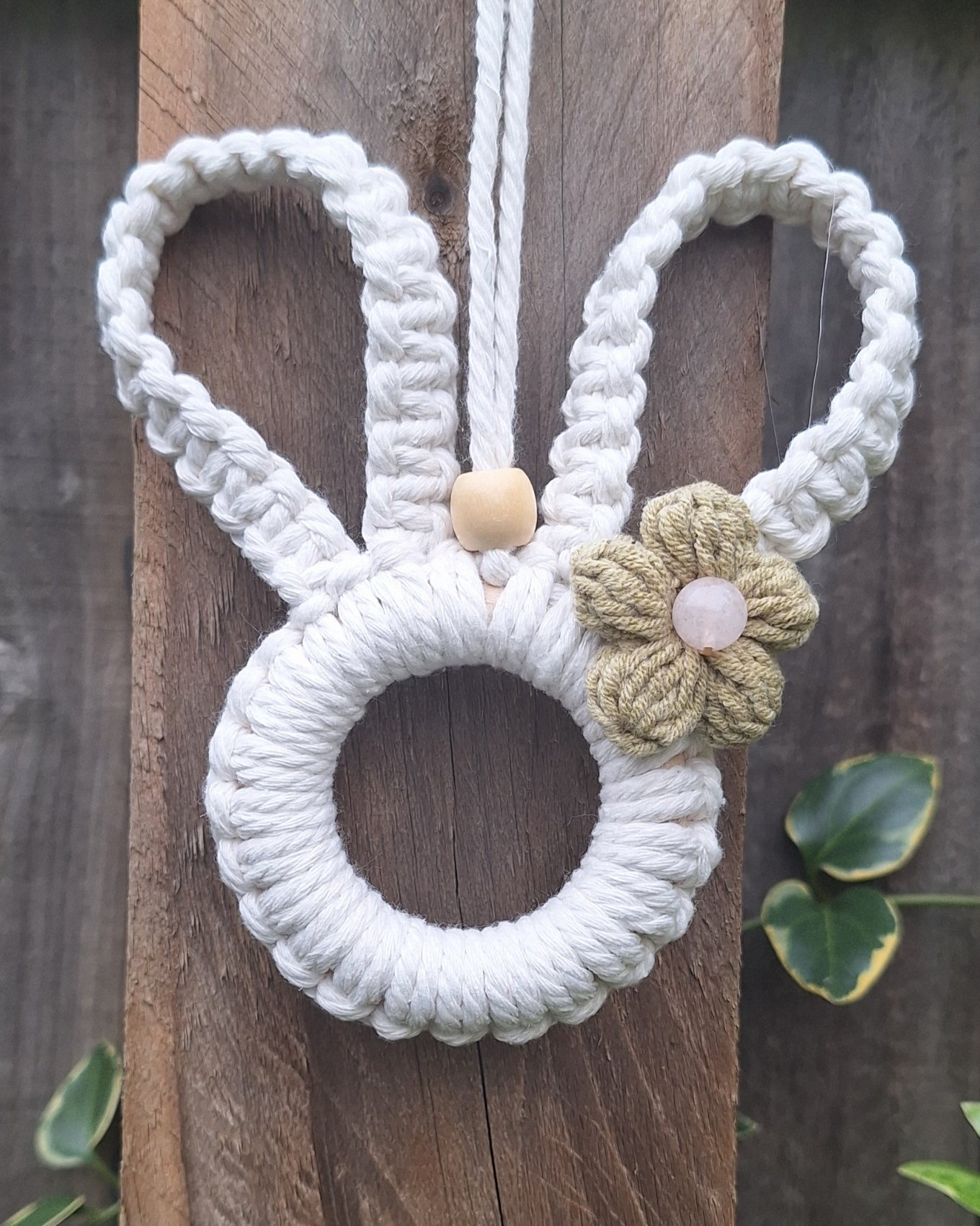 Infuse your home with the charm of spring and Easter using this Handmade Macrame Bunny Hanging Hoop. Each piece is thoughtfully designed by myself, featuring a delicate crochet flower and rose quartz bead that exudes elegance and warmth. Perfect for celebrating the season, this decorative item adds a touch of sophistication to your space while reflecting the lively energy of renewal and joy.